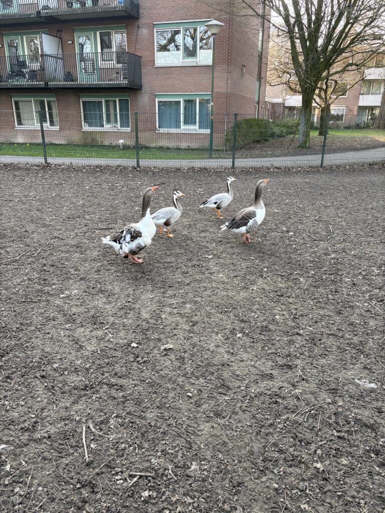 Krulganzen Atl & Anzar (2020) hebben vaste vrienden gemaakt: ze worden vergezeld door twee bezoekende Indische ganzen.
